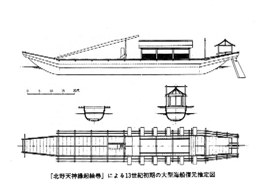 In any case, the section on the Kamakura era ships has a drawing of the large umi-bune which includes top and side views as well as a couple cross-sections. Given that the cross-sections on a ship of this type are essentially identical, and actually included a scale, I decided to give it a try as a scratch build subject. At some point, I’ll try to execute a decent drawing of my model. For now, here’s an image I found on a Japanese blog site that appears to be from one of Professor Ishii’s book.