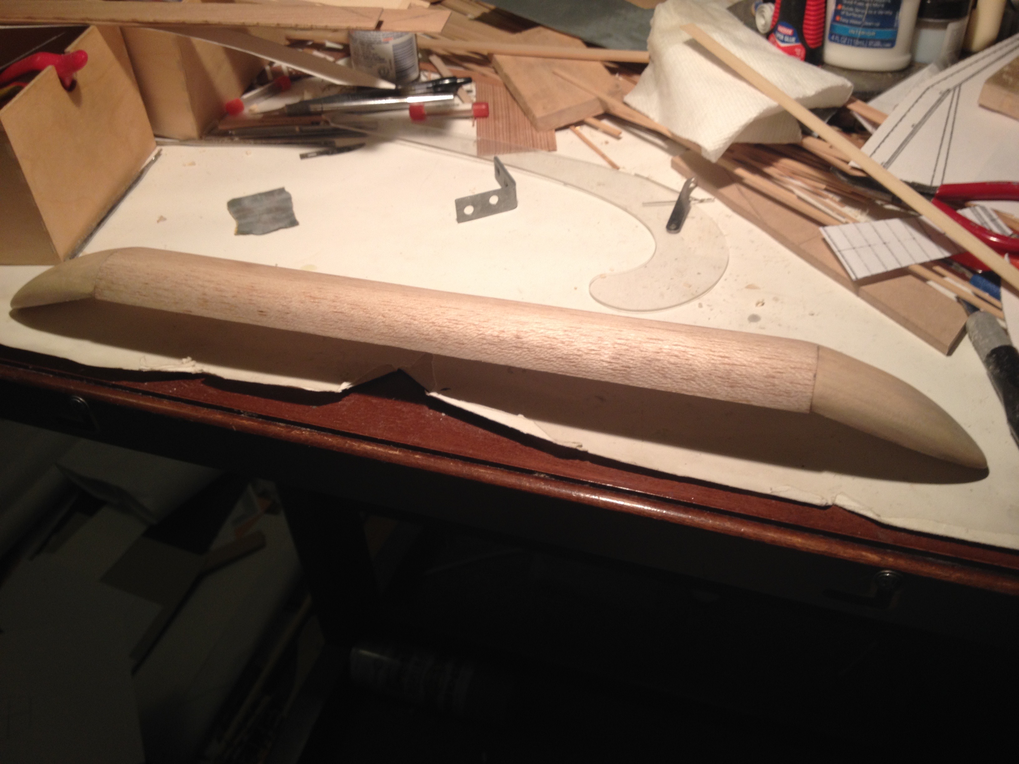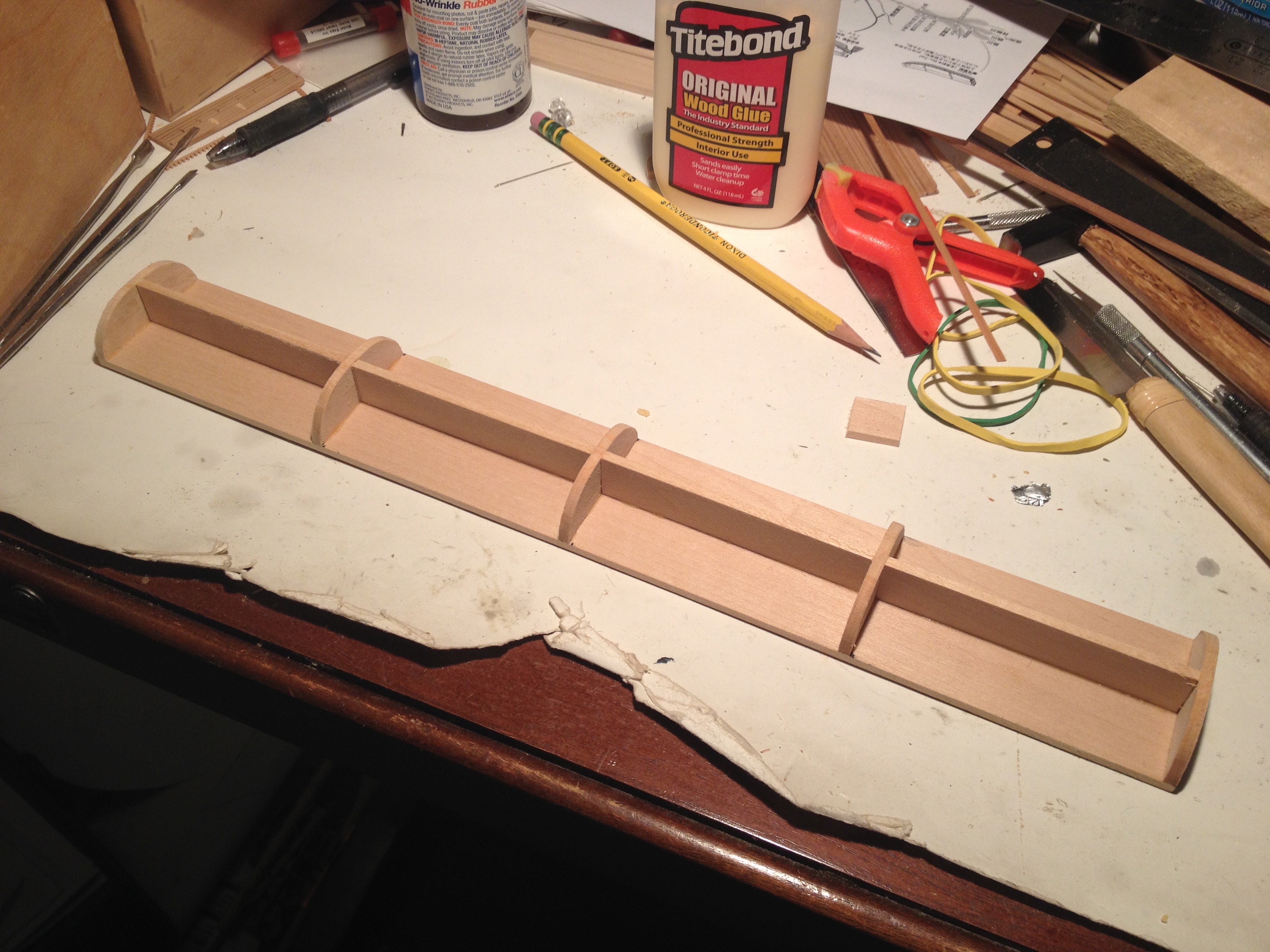 I thought about methods of hull construction for this model for quite a while before I got this far. I could have tried my hand at carving the hull inside and out, but decided I could go an easy route and make the basic, semi-cylindrical hull plank-on-bulkhead fashion since the deck would cover the interior anyway. The cross-sections in the drawing provide me with the exact shape for the bulkheads. I would then cover the bulkheads with a single, thin sheet of wood, which ended up being 1/32″ thick balsa for the sake of convenience.