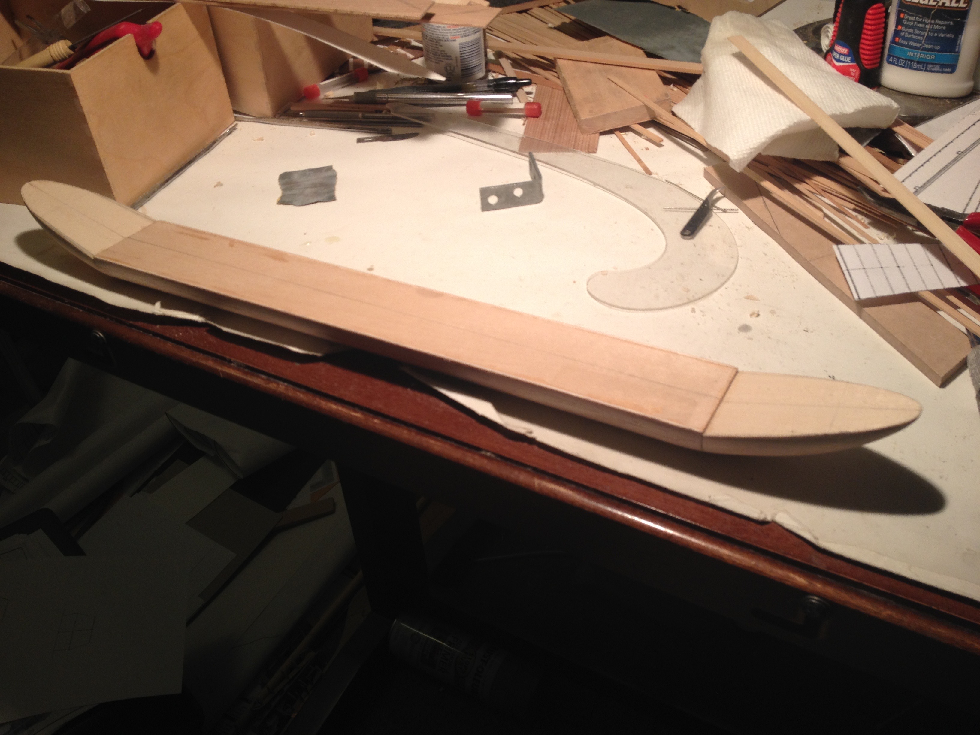 I wouldn’t normally use balsa as it dents way too easily, but I figured that for the long, straight, narrow hull, I could make it work. Also, it was the easiest wood that I could bend over the hull frame. I got some thin plywood for the job just in case the balsa didn’t work out. I also considered using very thin veneer. But, the balsa seemed to work well enough.