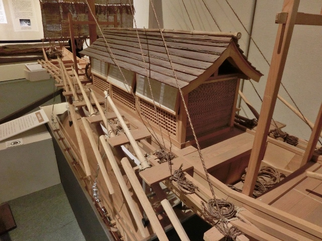No, that’s not my model. This 1/10-scale model of a Kamakura period umi-bune is on display at the Kanagwa University, which is home to the Institute for the Study of Japanese Folk Culture. The photo was taken by my friend Masami Sekiguchi, who is one of two Japanese ship modelers I met with in Tokyo last September. The other is Norio Uriu, Both gentlemen are members of The Rope, the Japanese ship model society in Tokyo.