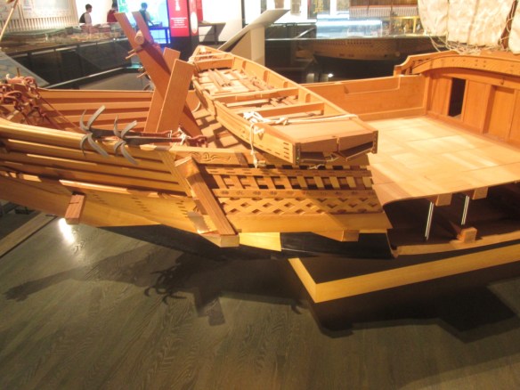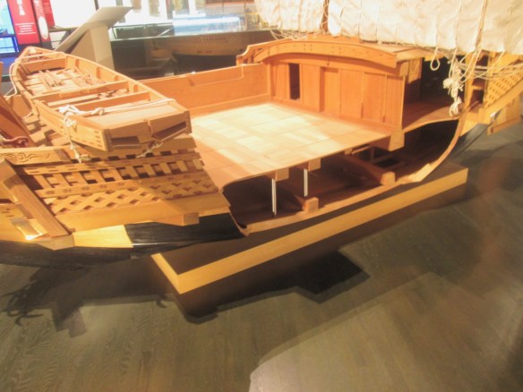 The model is a cut-away type, showing a glimpse of the interior spaces and construction. However, it doesn’t show how cargo was stored or how the crew lived in the large cabin on the deck. Here, you can better see the design of the tenmasen.