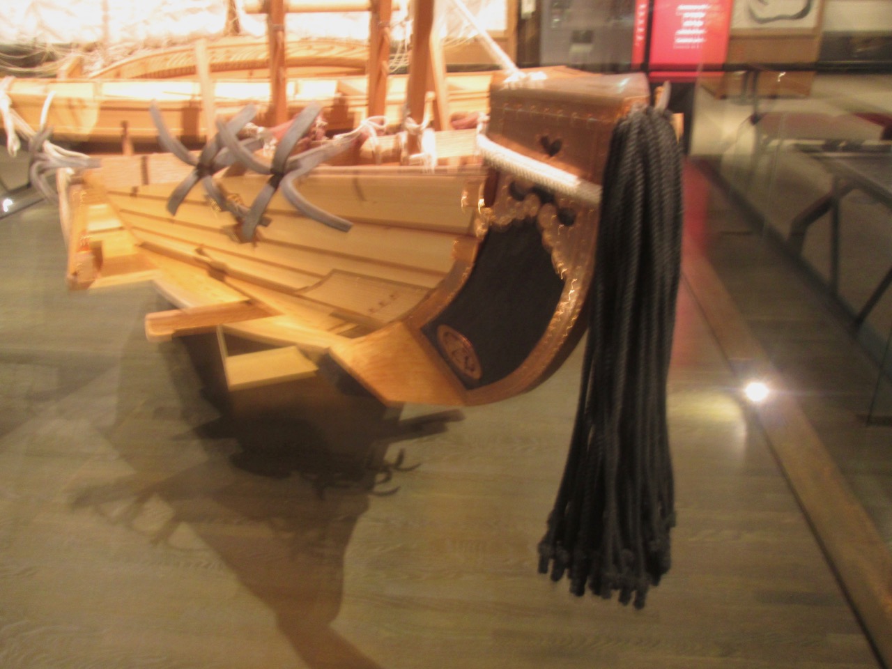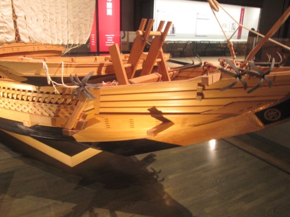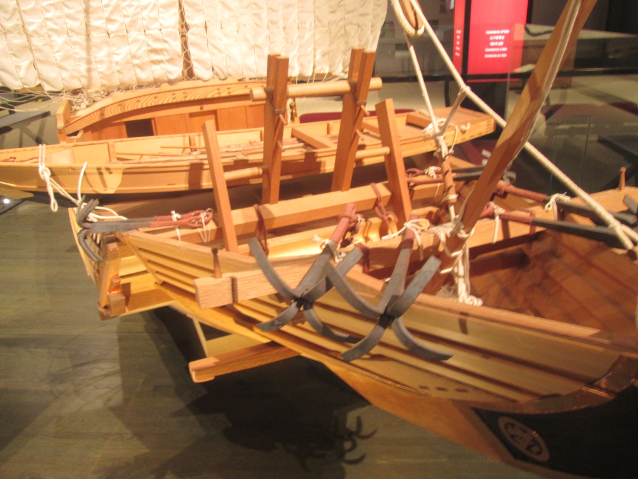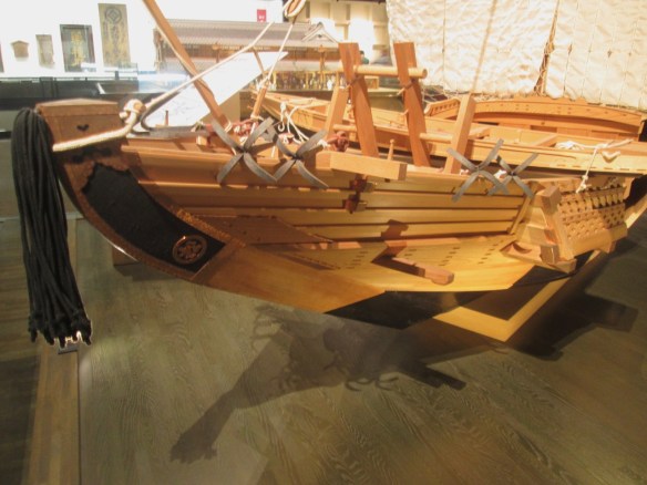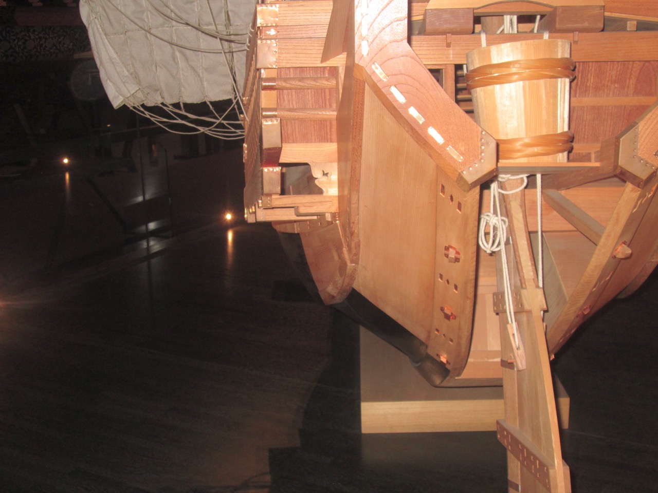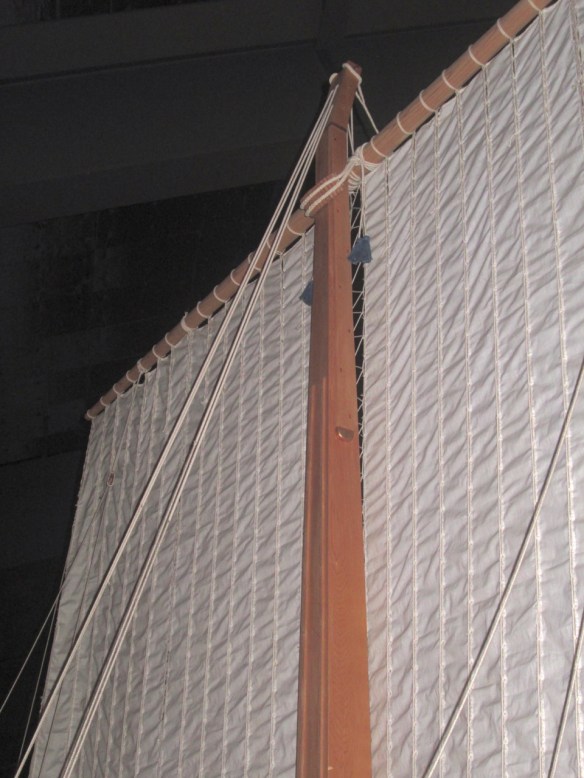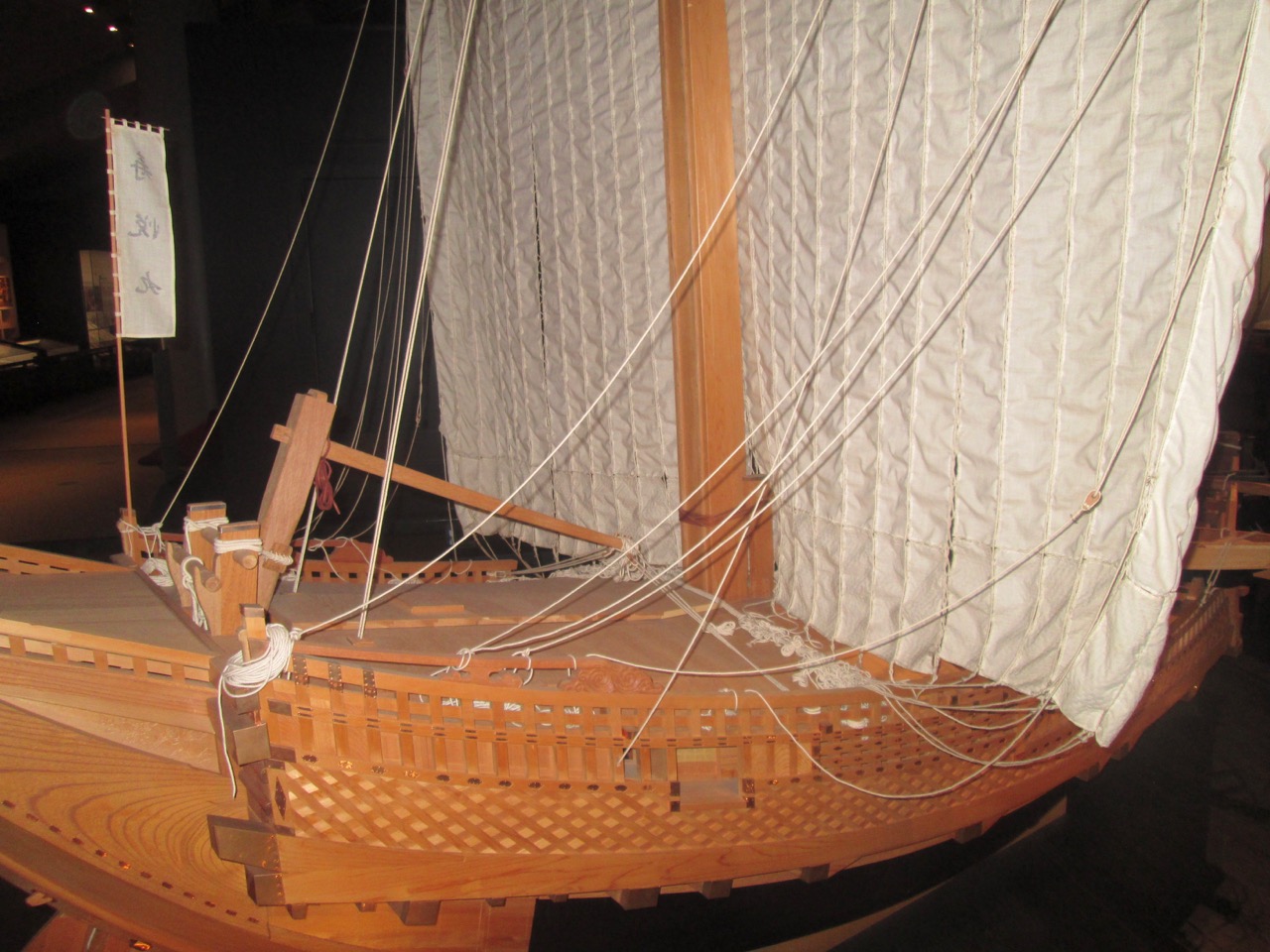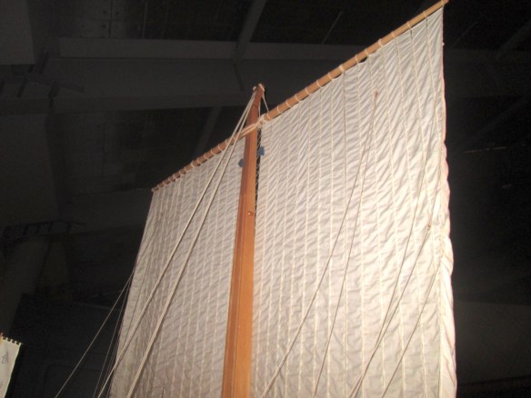 As I mentioned in my post showing the Sengokubune Model at the Toba Seafolk Museum, my model definitely lacks tassels. Here they appear to be possibly on the ends of the lines used for the parrals. Also, you can see the gap in the lacing down the center of the sail. That’s a feature missing in the Woody Joe model that would be a very nice touch to add.