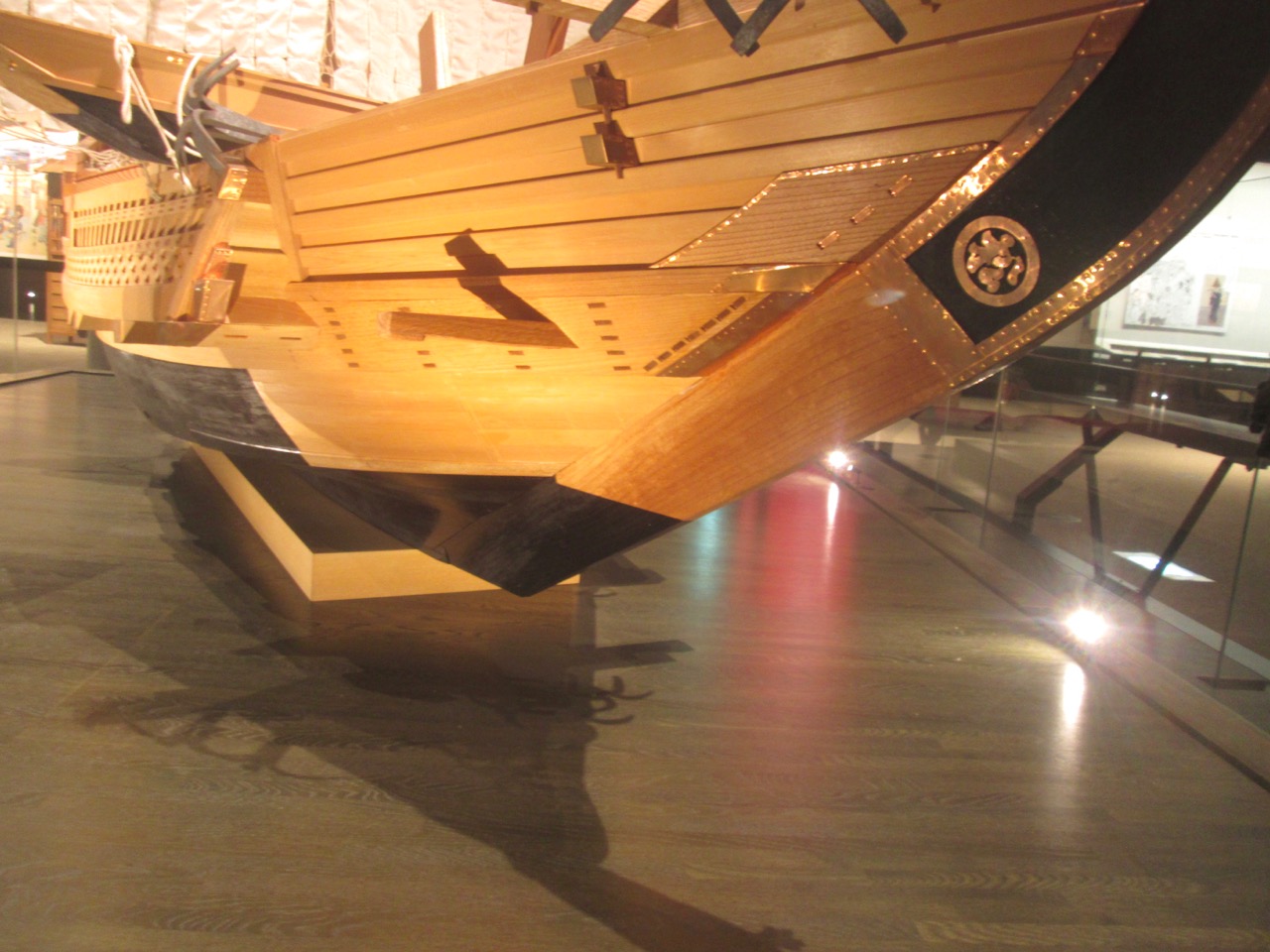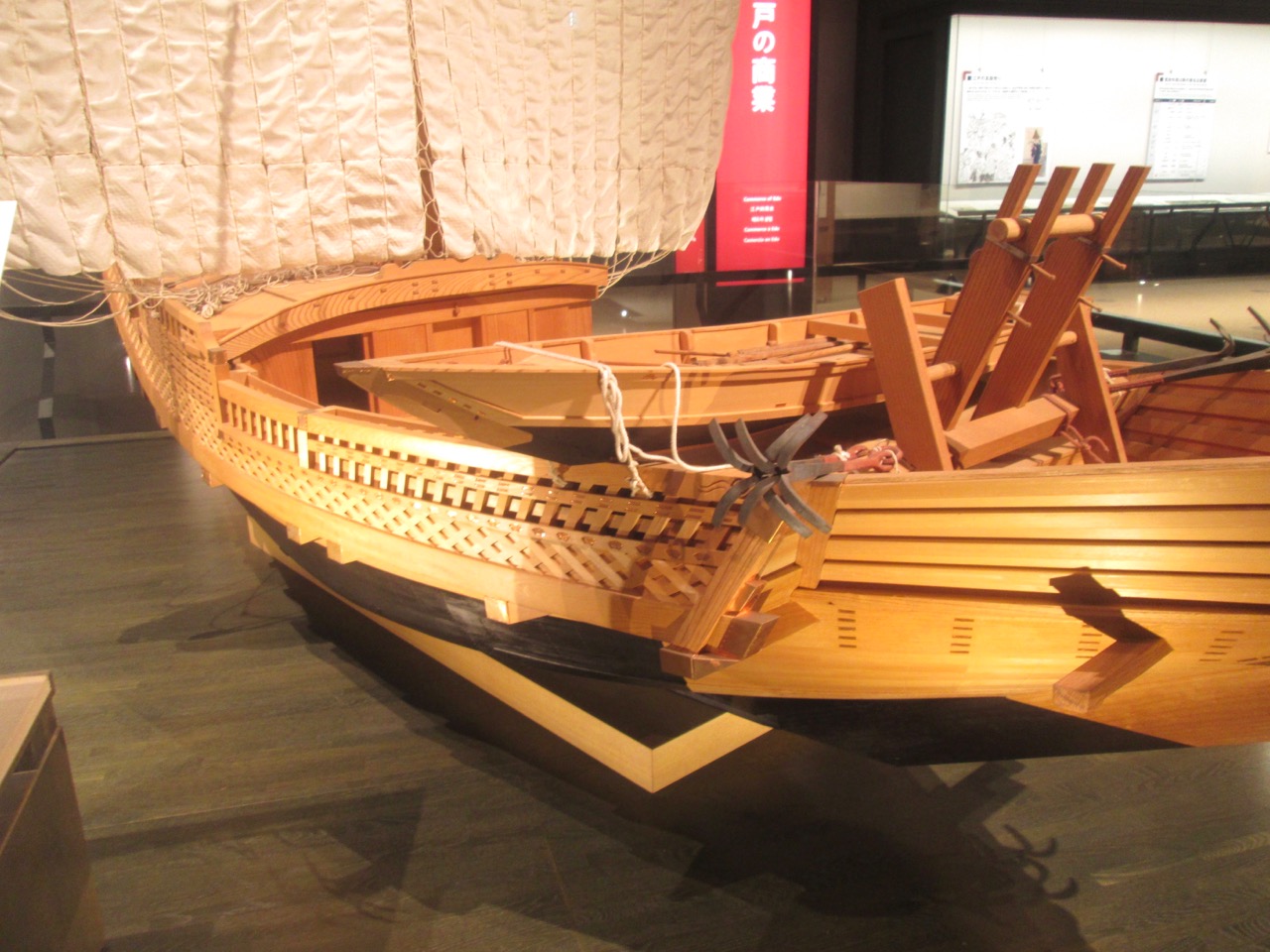 The subject of my second Japan boat/model posts is a large Higaki Kaisen model (檜垣回線) located in the Edo Tokyo Museum. The ship is a type of sengokubune (千石船), or 1000 koku ship, a type of bezaisen (弁才船) or coastal transport.