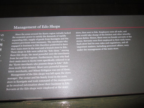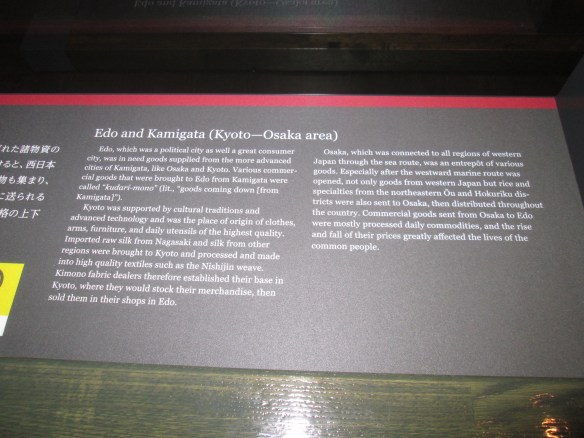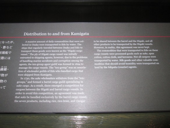 Possibly the most useful part of this exhibit is actually the description of commerce and flow of goods from the Osaka area to Edo. Reading this gave me the best understanding yet of the importance of these ships, the commerce they carried, and also the first serious reference I’ve seen to the Tarukaisen or the barrel cargo carriers, and how their trade was related to the Higakikaisen. I still haven’t seen much reference to what the difference was between the Higakikaisen and the Tarukaisen. Supposedly, Tarukaisen were reinforced for the heavier cargo, but I’ve never found any details.