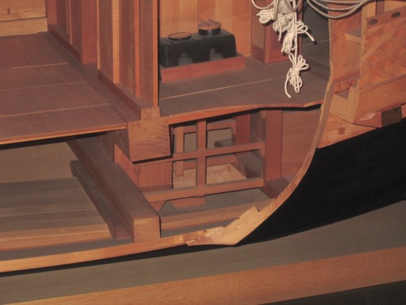 The stern detail was interesting, but I have yet to determine what the large tub is for inside the rudder cove. I’ve seen this on other bezaisen models. At first, I was thinking maybe it’s storage for fresh water, or something. It’s too tall to use as a bath. Now, I am wondering if it was something to quickly throw into the water if someone goes overboard. It seems awfully big for that, unless one simply climbs inside and waits to be picked up. This is something more that requires some investigation.