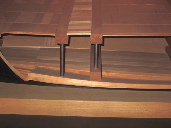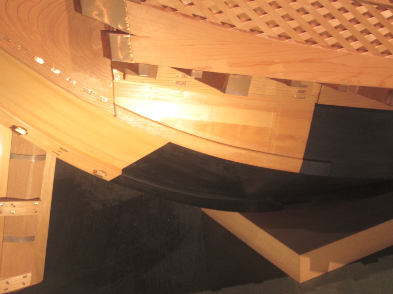 The cutaways show how thick the planking was on these ships and how heavy the beams were. The lack of frames is a feature of Japanese watercraft. Though small boats are sometimes fitted with a few sawn frames, the planks are mostly edge fastened, and any frames are added after the hull is built.
