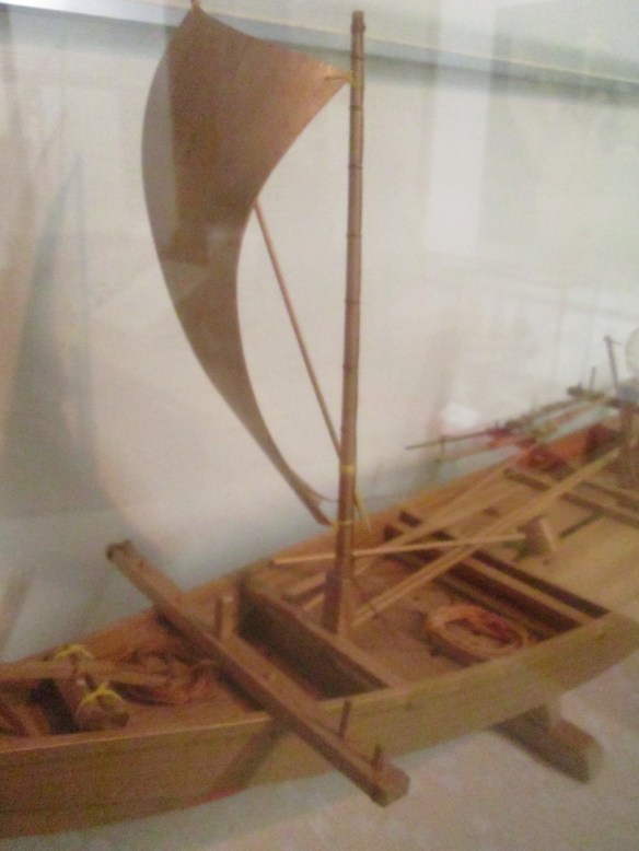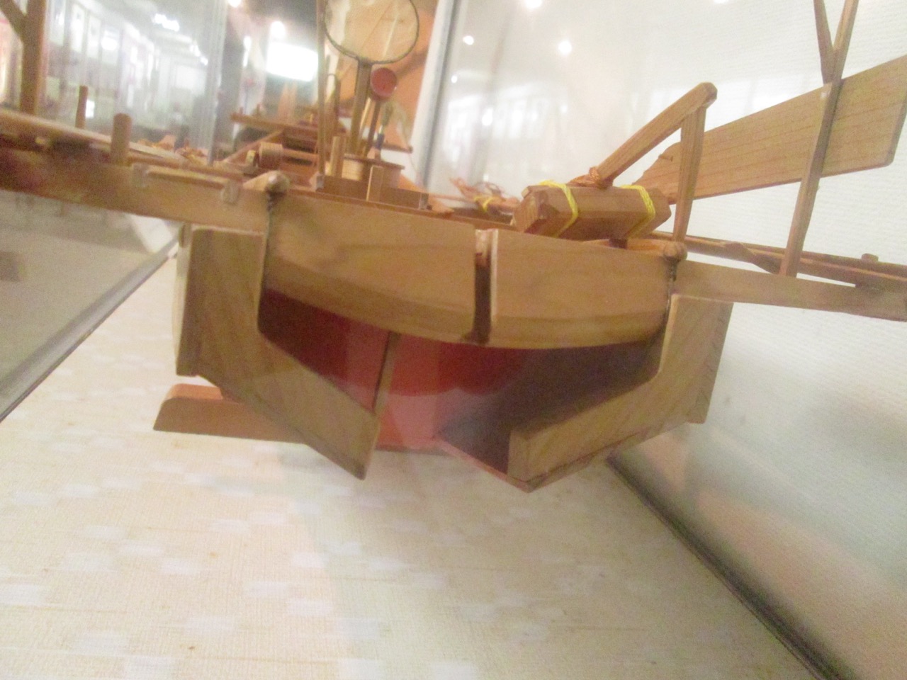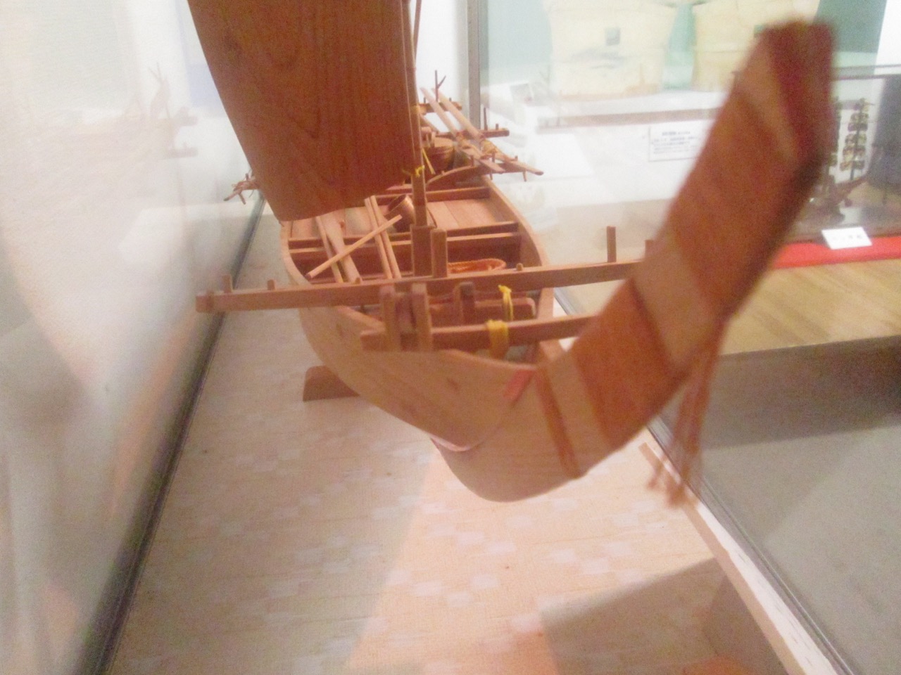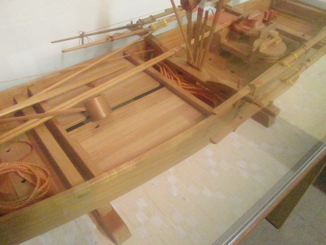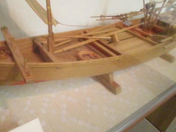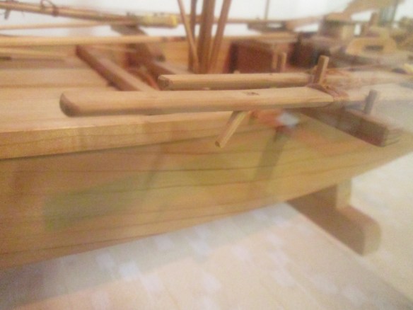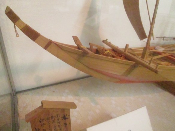 My apologies again for the grainy low-light photos. Here’s another view of the wooden sail. Of course, the real boat didn’t use wood for the sail. Japanese boats used cloth sails, just like anyone else. However, early boats, like the Kamakura period umibune, did use straw mat sails, but that was many centuries before this boat.