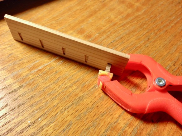 I clamped it into place until the glue dried, then I cut the plug loose and went to the next mortise. One thing you might notice if you look very carefully: I originally carved out the mortises in a sloping angle, which is how it’s done on the real boat. The end where the nail goes has to be deep enough to fit the head of the nail. But, I found better looking results here by carving them out evenly.