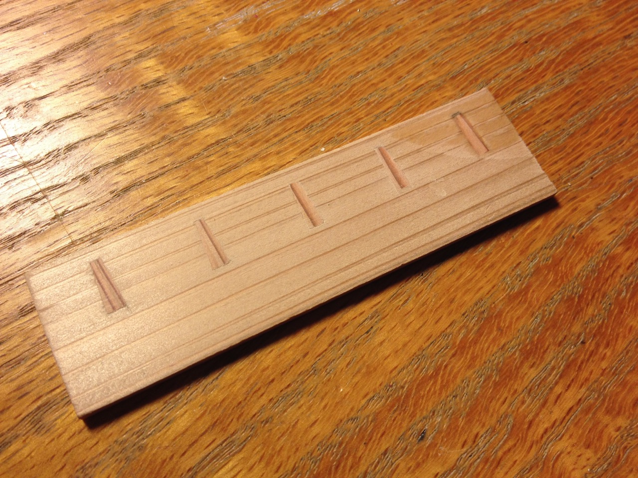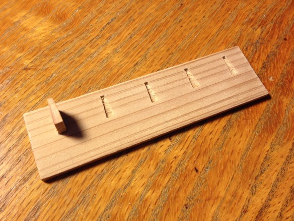 Like the full-sized ayubune, I will cut all the mortises and fill them with wooden plugs. I tinkered with the idea of using small nails, but nobody makes miniature flat nails, so I’d have to make them myself. This seemed a bit over the top, at least for now, so I won’t actually be nailing the boat together, and the mortises will only be a visual detail.