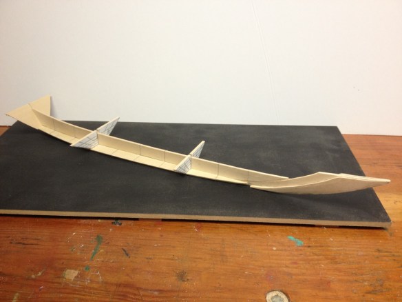 Getting the shape was a bit odd using these plans. The bottom is a single surface, but waterlines are meant to show the shape of the hull at specific depths. That’s not necessarily the shape of the bottom piece. So, I had to do a lot of staring at the plans to convince myself that the pattern I made for the bottom was correct. Or more importantly, that it worked.