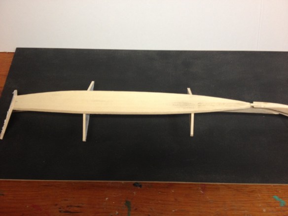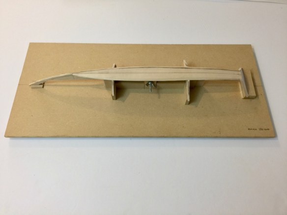 As you can see, I have a butterfly nut for clamping the hull, and I have supports for the transom and the bulkheads. This fixture should keep the base of the hull stable so it doesn’t bend or twist while the hull planks are measured off and put into place.