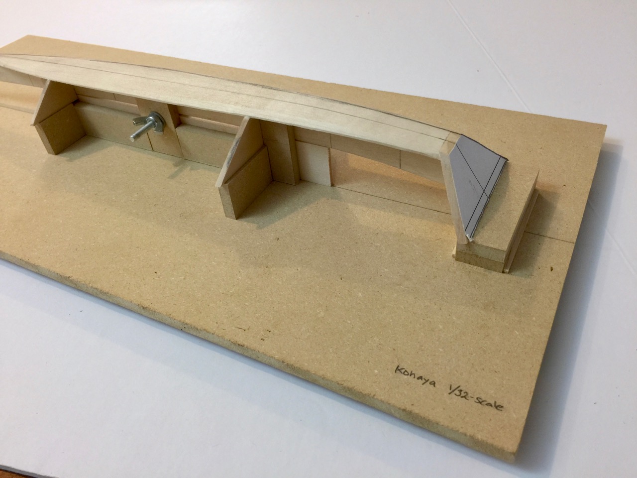 Now, I’ve been dealing with the issues of holding a model like this in place for a while. The body of the model needs to be stiff, and both the transom and stem need to be held so they don’t bend or twist while holding a planking template against them. I came up with something that worked okay for the Hozugawa-bune model recently completed, so I did the same thing for the kobaya. I made a custom fixture for the model that holds the model securely.