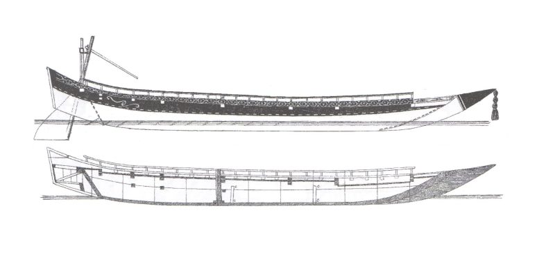 The Paris drawing describes a small row galley, but is in fact a gozabune of a type commonly referred to as a kobaya. The drawings I found were a bit tricky to use as they came from either poor quality scans from a book, or good quality scans of a low resolution image, again from a book. But, all I needed were some larger measurements and basic details.