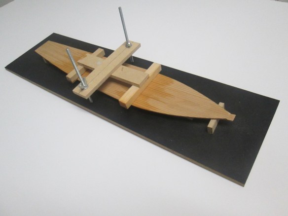 The shiki is bent slightly. In some areas, boatbuilders use fire to heat bend the wood. Apparently, the bekabune’s floor was just propped to the right curve and the added hull planks hold it to its shape. On my model, it was a lot easier to bend the assembled shiki using water, so that it would hold it’s shape on its own. For this, I used a fixture that just pressed the assembly down against blocks located at the bow and stern. It’s necessary to over-bend slightly, so the wood springs back to the correct amount of bend.