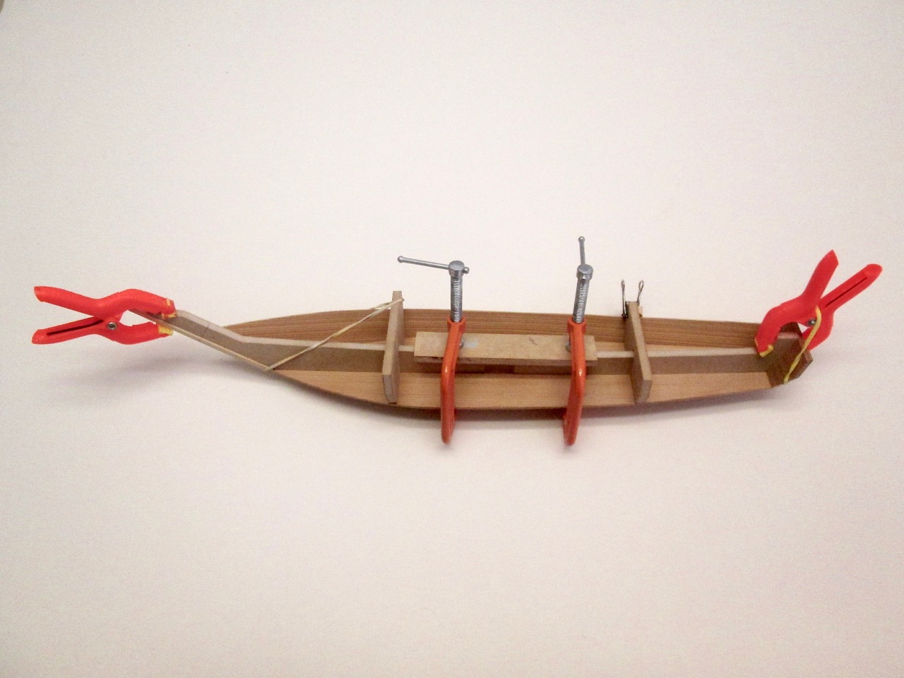 This method was definitely a bit flimsy, and I’ve since upgraded to a more stable method, but it worked. As you can see, I have a piece of wood in place on the starboard side of the hull for the kajiki, or garboard plank.