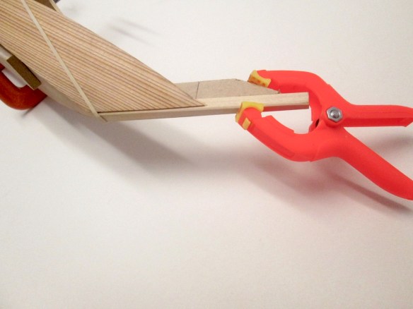 Holding the plank against the formers required some creative methods. But, I think all ship modelers are accustomed to getting creating with binder clips, rubber bands, clamps and more.