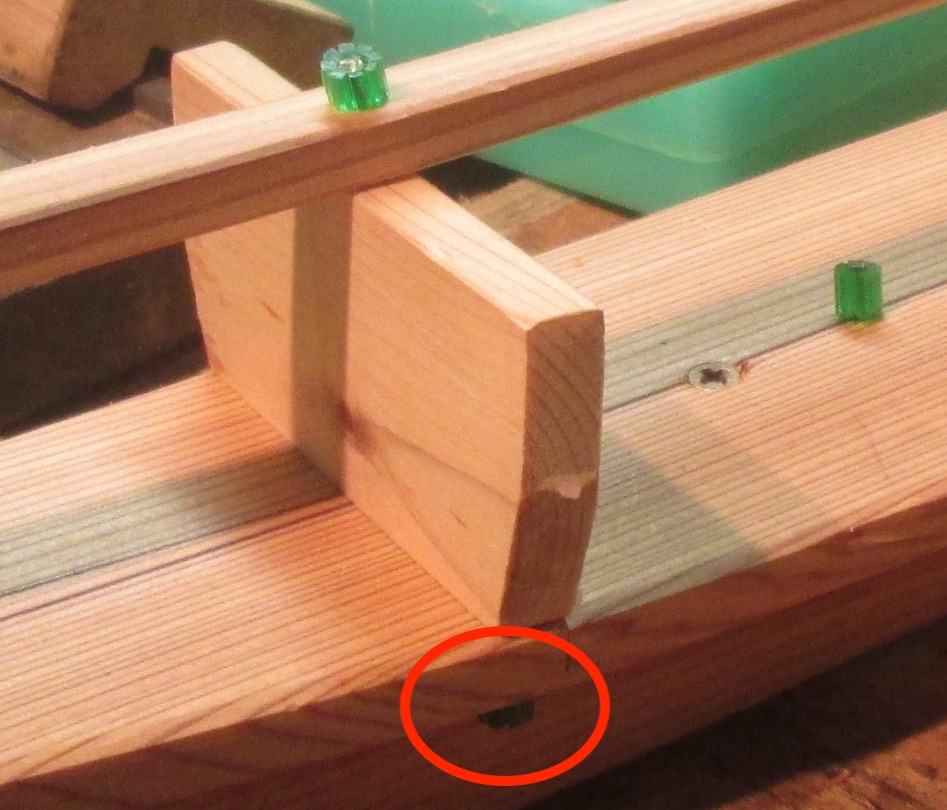 This was interesting, and I can see how it would work very well. But, in order to make it work, they ran a screw through the bottom of the hull. They also had to fasten temporary formers to the bottom as well. I didn’t notice any signs of glue in the bottoms of their models, so I’m figuring these were temporarily pinned or nailed together with nails that had a plastic grip on the ends. In fact, if you look at the zoomed-in photo below, you can see the one on the underside.