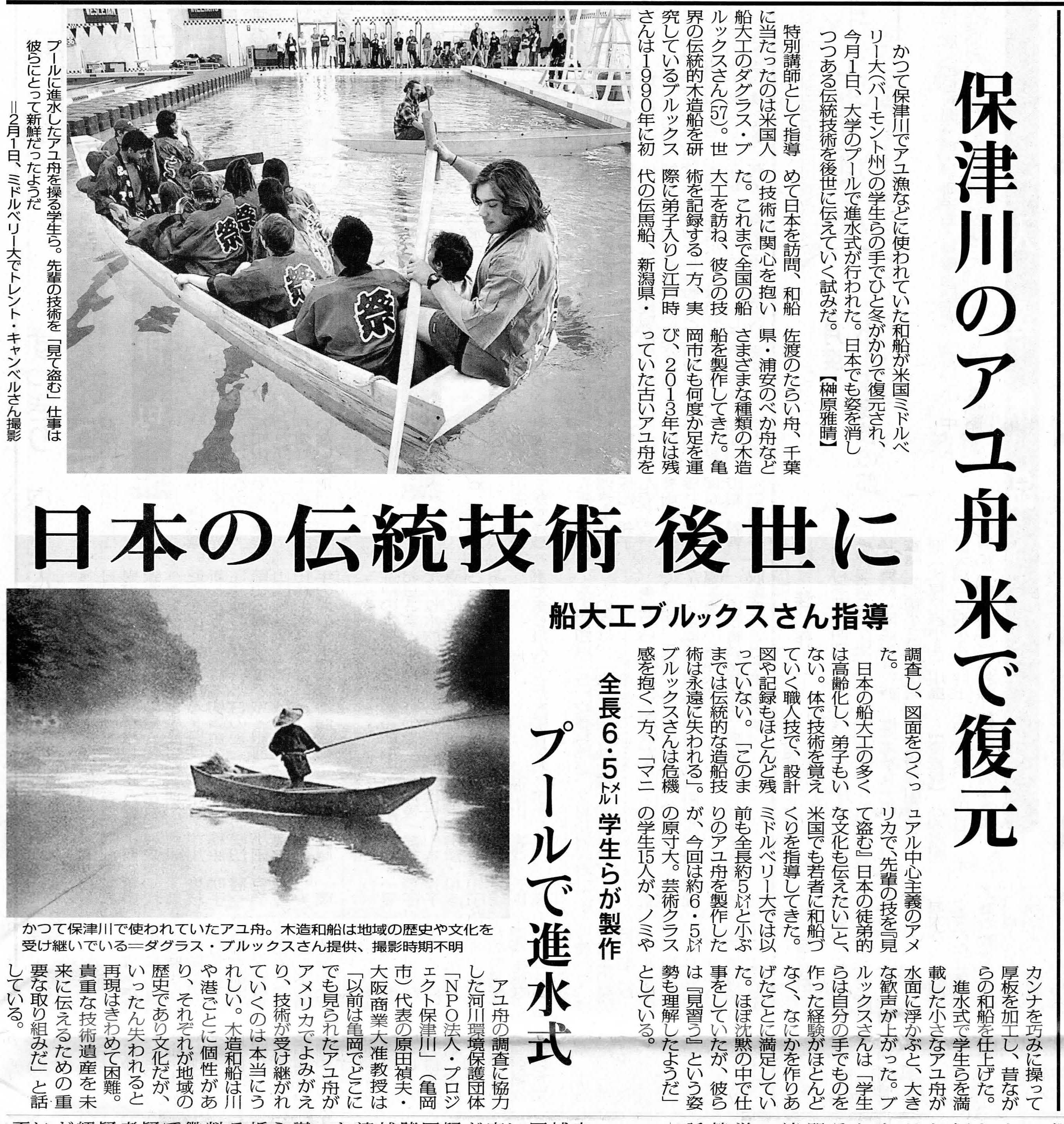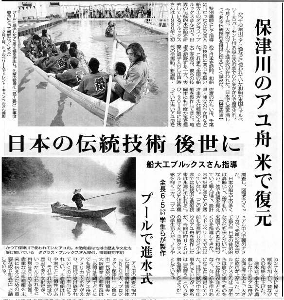 This article appeared recently in Mainichi Shimbun, one of Japan’s three largest newspapers. I can’t easily read much Japanese, but this article mentions the pool launching of the Hozugawa Ayubune that the class built.