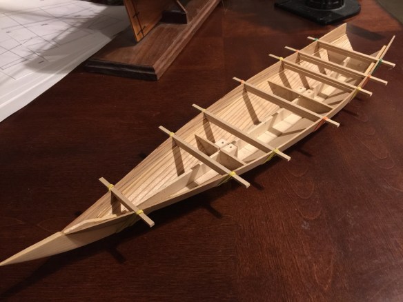 The full-length beams are now glued into place using Titebond and I have to decide whether to add the beams for the rails first or the ones for deck planks. In any case, the blog posts have caught up with my project progress, so now it’s time to look at this all and consider what to do next.