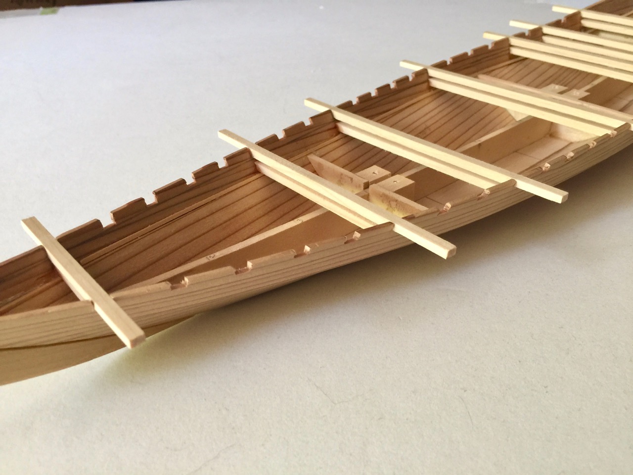 If you look at the Paris drawings, you will see that there are seven pairs of main beams across the hull, not including the otoko, or great beam, at the stern. In each pair, there is one beam above and one below. The lower beam runs between hull planks. The upper beam goes through the hull planks and supports the rail assembly, which supports the yokes for the sculling oars.
