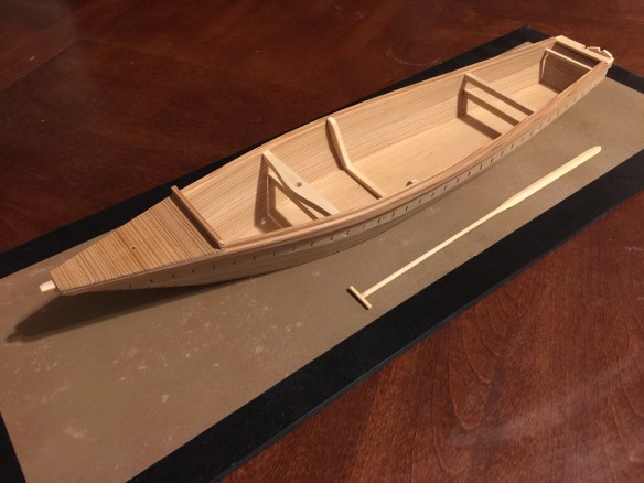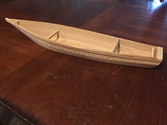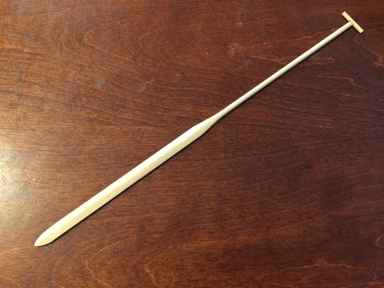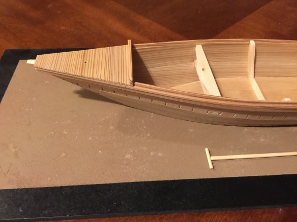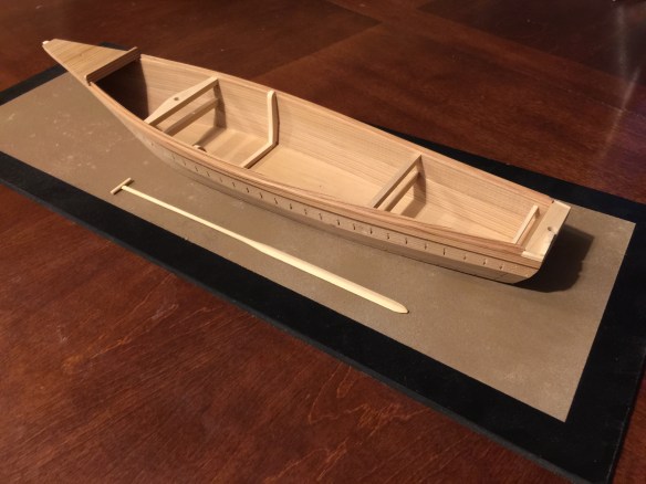 The only accessory I decided to add to the boat is a large paddle or kai. This had a T-handle at the end and could be used as a paddle or as a sculling oar. Because of the length and delicate nature of the paddle, this is the only item I made from non-Japanese wood. I considered milling down an old Japanese drumstick I have, which was made of ho, which I believe is Japanese magnolia. But, I took the easy way out and just used a strip of Castello Boxwood I had on hand.