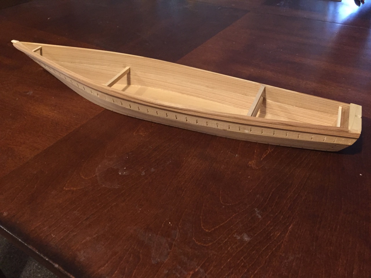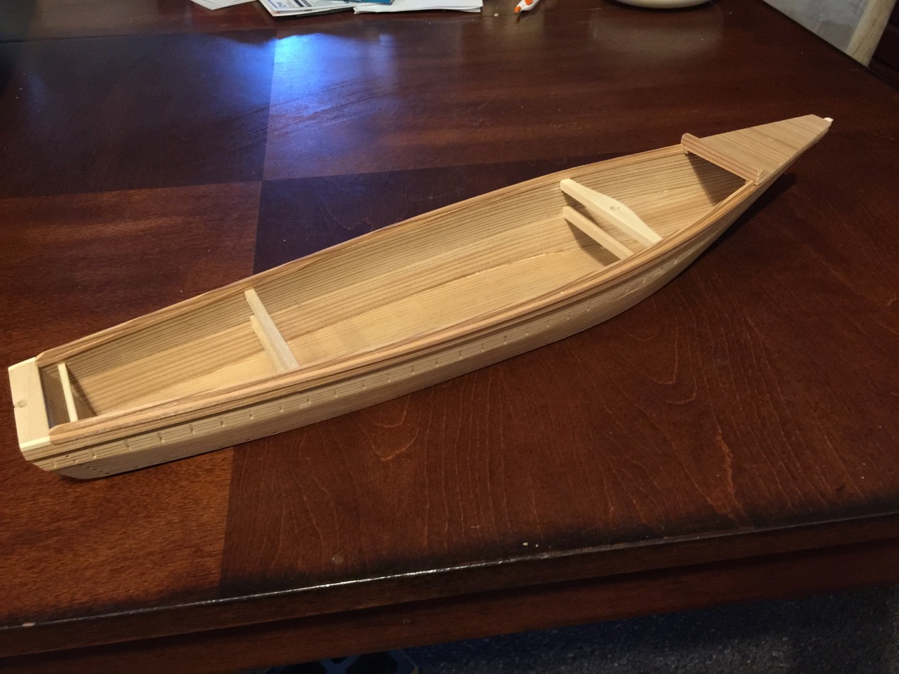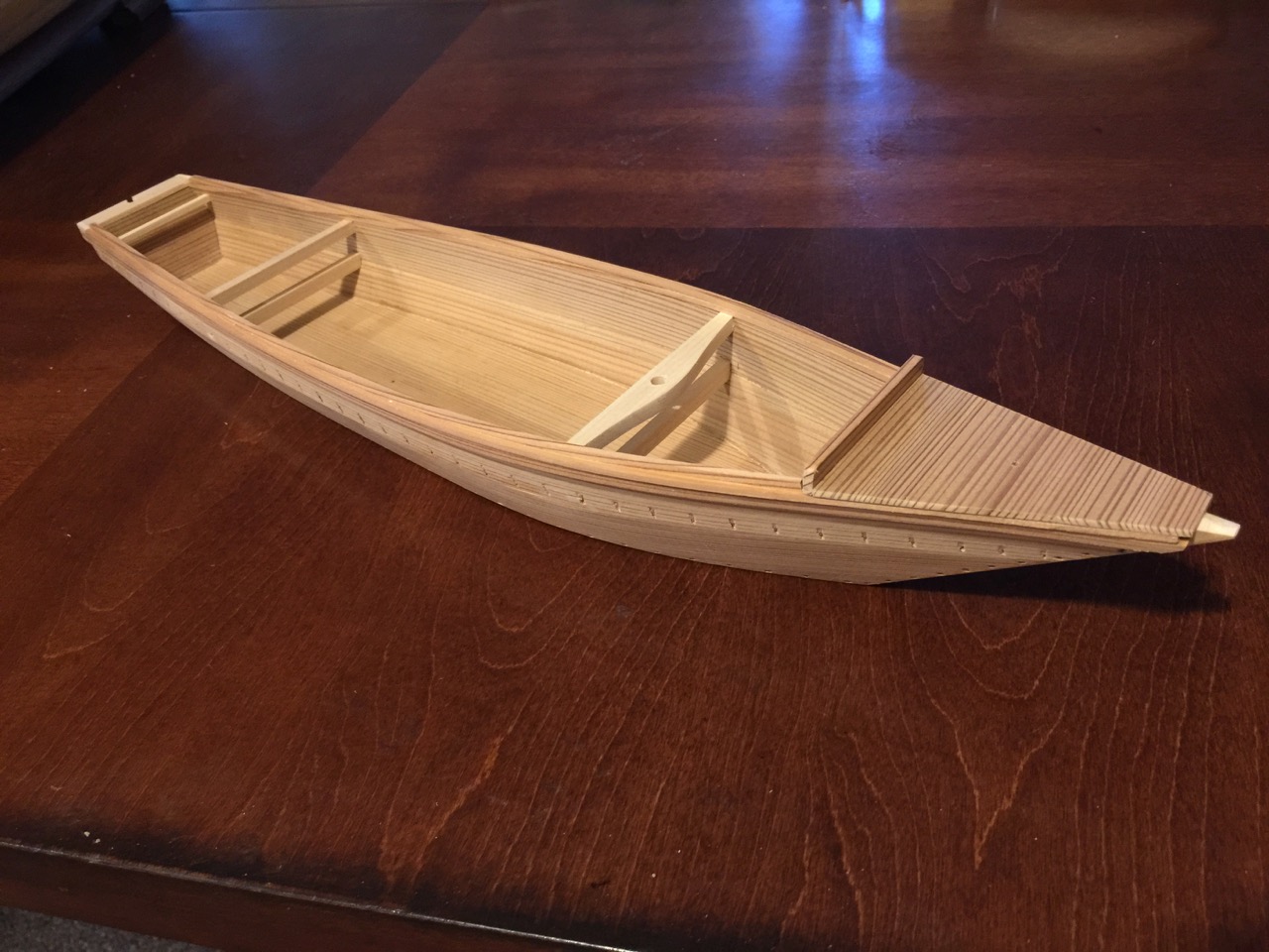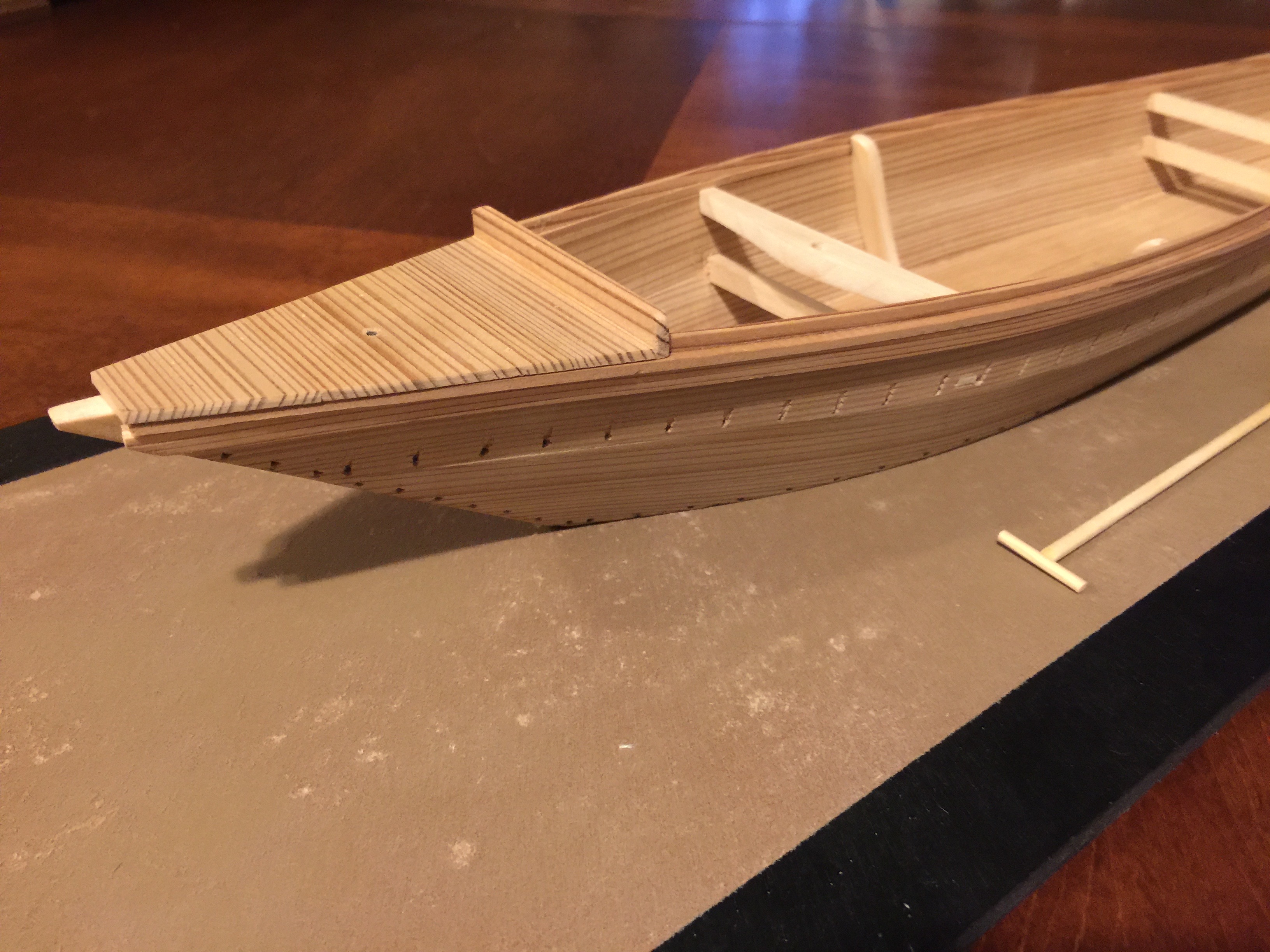 Toko shows the pieced I had to add at the ends. Also, note the photo was taken after I installed the yoke for the sculling oar and a mooring line on the aft kotsunagi.