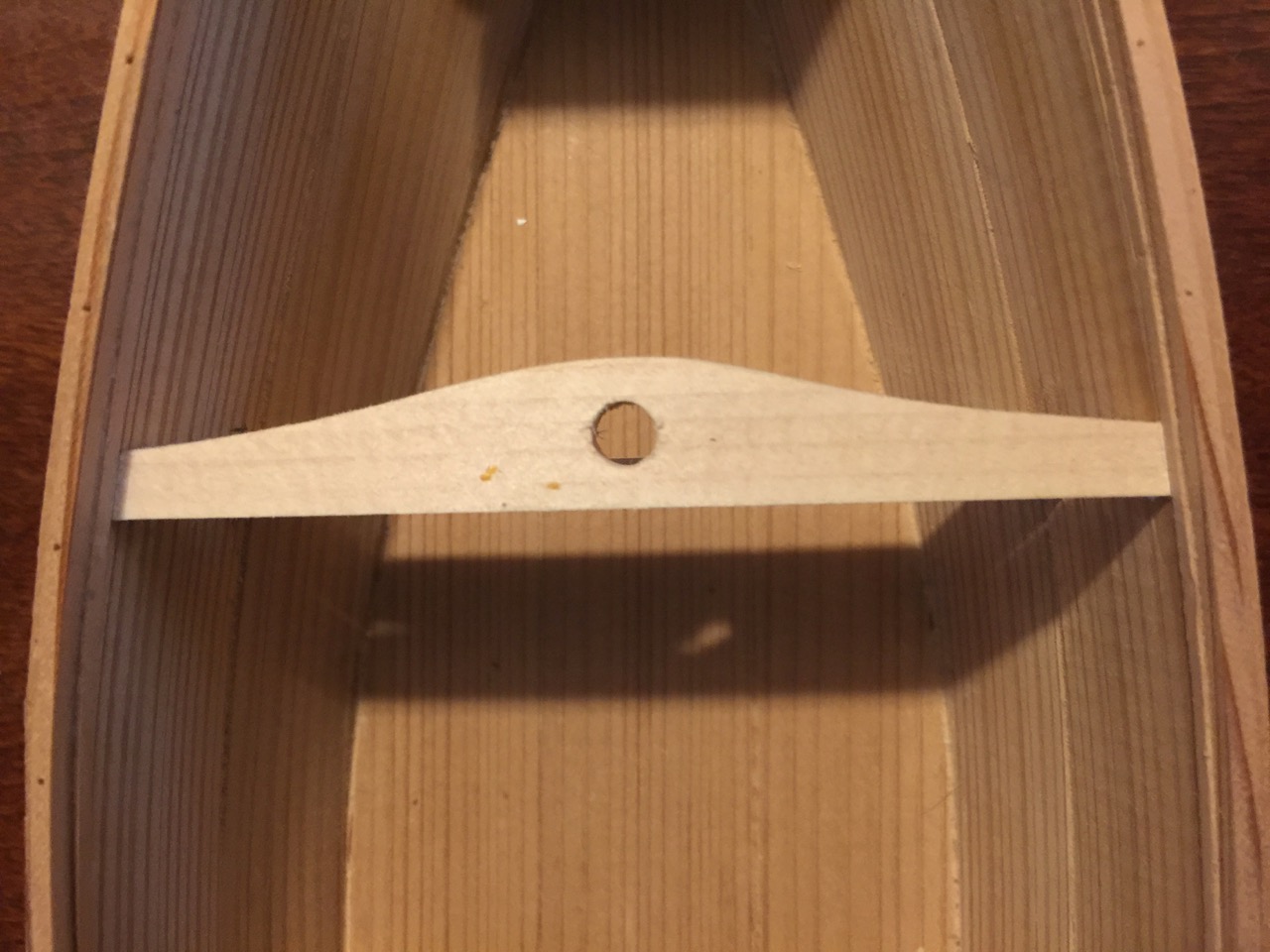 But, before fitting into place, it was necessary to cut a hole for a rudder post, with a notch cut out of the stern for the rudder blade.