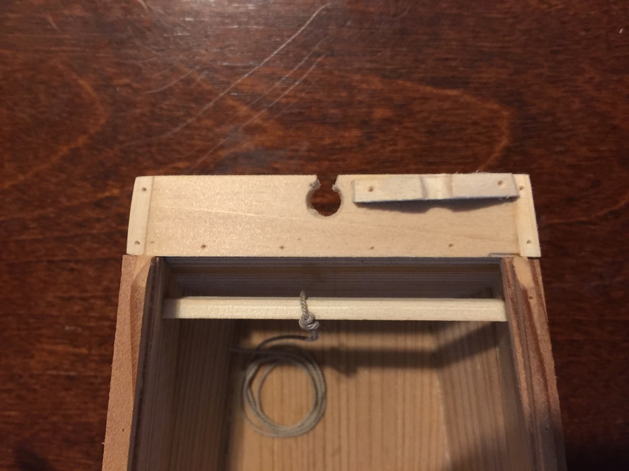 This cover is removable and I simply glued a couple strips to the underside that keep it from sliding out of position. A hole drilled in the center of the cover allows a mooring rope to be passed through and tied to the bow kotsunagi.