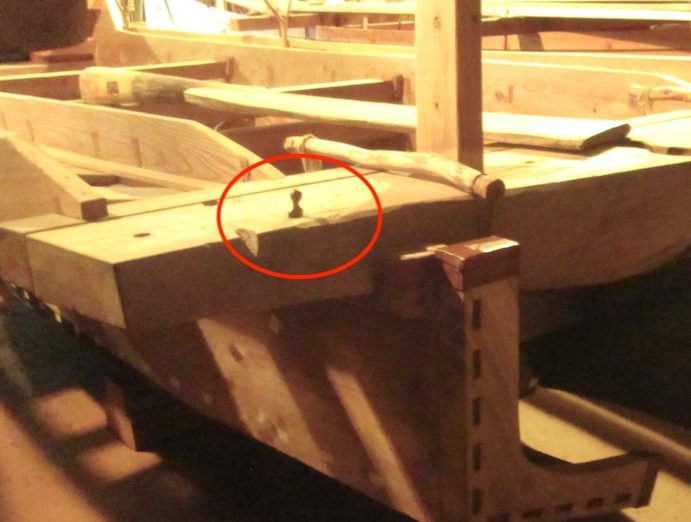 The rogui (roh-goo-ee) are the pivot bases for the ro, or sculling oars. On this vessel, there are 14 on each side, for a total of 28.