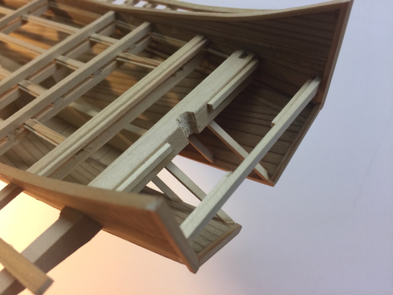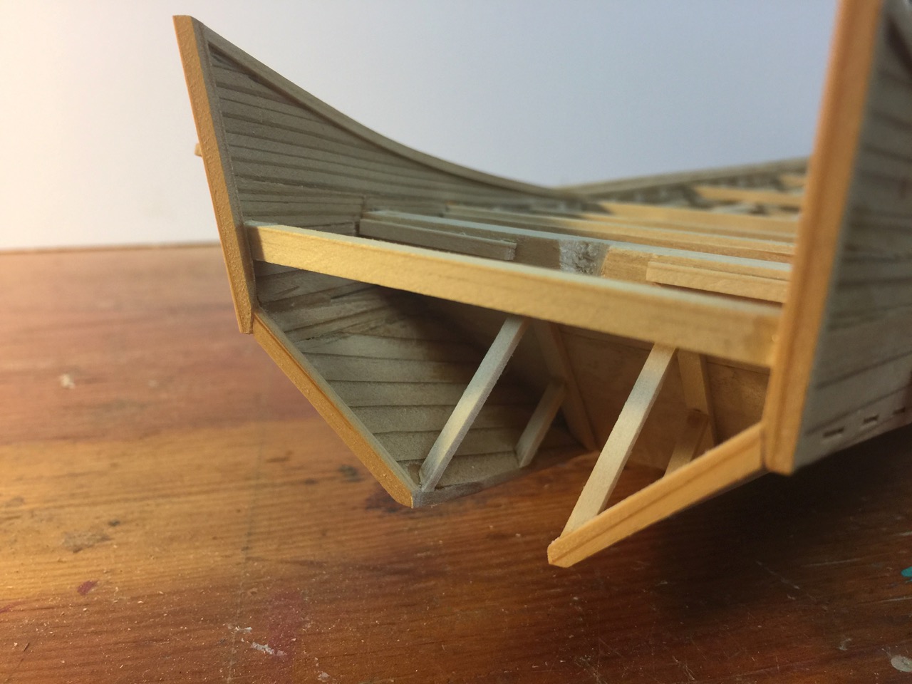 In addition to the bracing of the lower planks, I added the cross beam that appears in the plans. And, while the plans are not clear on this matter, I went ahead and added ledges for the laying down of deck planks on either side of the rudder well. Part of the decision was due to a photo of the model in the French national maritime museum, which shows deck planking here.