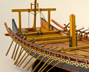 So, I drilled out the rogui on which the ro, or sculling oars, pivot. I used a sharp point to start the hole and finished up using a small drill in a Dremel rotary tool. Because I’m starting to consider painting the model, I’m going to hold off on adding the pins to the rogui until some later time.
