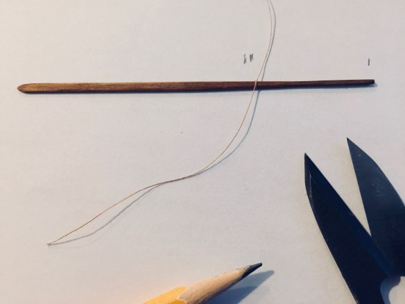 I started by tying a length of line around each rope at the pivot point. I used pencil marks for measurement. I didn’t feel this needed to be exact. There is an extra pencil mark, as I realized I wanted the pivot point just a little higher up on the handle. Thread cutter and pencil included for size reference.