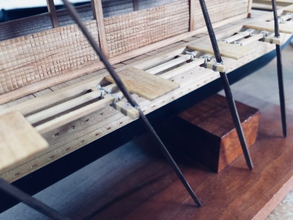 Tying the rope then onto the model, I kept the knot-side against the beam. I can’t quite explain the final wrapping, as I kind of figured it out as I went. Something like wrapping both ends under the beam, over the top a couple times, making sure to stay on the opposite sides of the oar, then tying a final knot around the rope in between the oar and the beam. This turned out to be as challenging as rigging blocks on a square rigger.