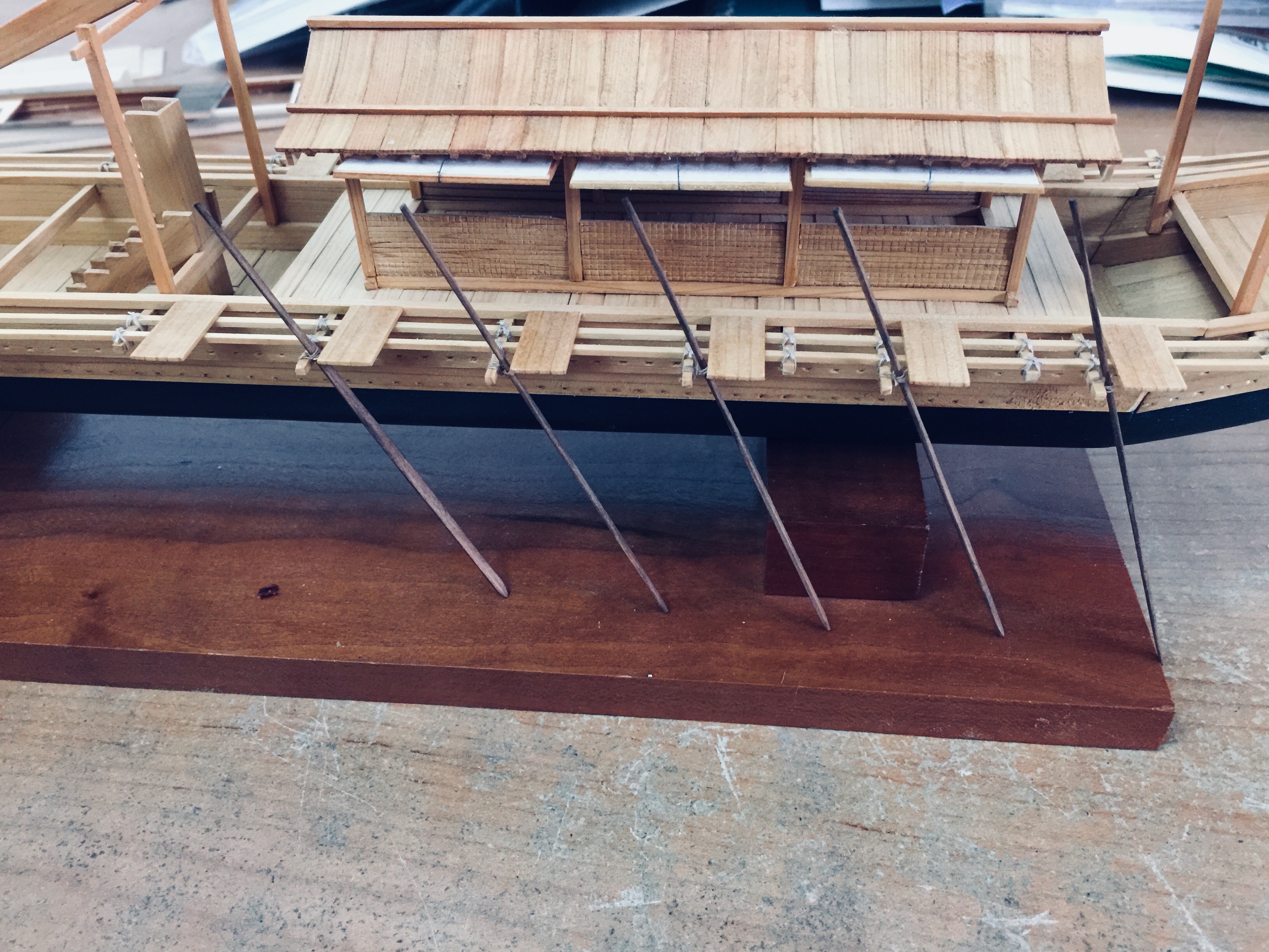 You may recall that this boat has one large sail. I don’t know if I will mount a sail on it or not. I find it rather interesting how the lowered mast is stowed. I think I have a method for creating the sail, which was made from rice-straw matting, not cloth. But, I will have other opportunities to make that, and it would probably be simpler and more realistic at a larger scale.