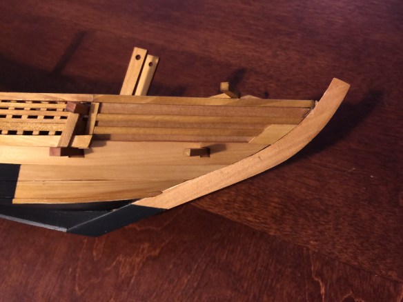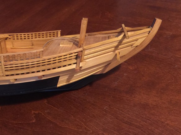 Now, I’ve kind of jumped ahead in my descriptions here, and I should point out the other steps completed. These include finishing the bulwarks at the bow, the addition of the beams at the bow, and the addition of the stern deck. Below is a series of photos showing the added bow detail.