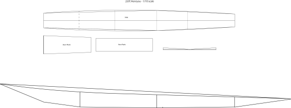 I have been asked to build a 1/10-scale model of the boat for fundraising purposes. On the surface, this seems like a very simple project. After all, not including the planks that make up the seating platform at the stern, I count a total of 8 pieces. The trick on this subject is that the measurements I’m getting are traditional Japanese boatbuilding measurements. This means I get certain key measurements, but I don’t get any angles (though I did get one for the angle of the hull planking to the bottom board). So, many of the details I’m going to have to derive mechanically.