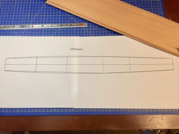 The pieces at the top will be used as cutting patterns, except for that thin piece on the right, which is an angle guide. The side profile on the bottom will be used to create a backbone for the hull former, which I will cut from 1/4″ MDF (Medium Density Fiber) particle board. The hull parts on this model will all be cut from some newly acquired 3mm sugi, or Japanese cedar.