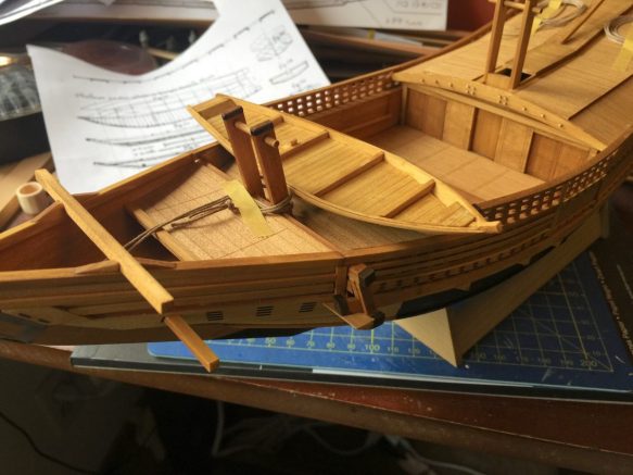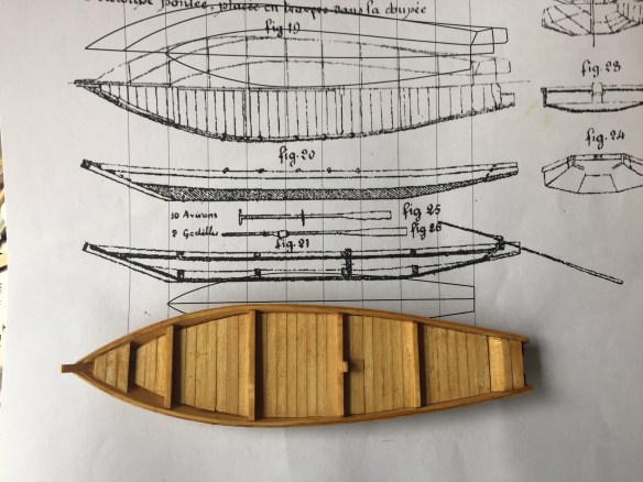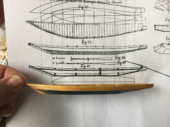 I had to adjust my tenmasen somewhat to fit the model, as the tenmasen in the Paris drawings was over 36 feet long. It would stick out beyond the sides of the ship, but I’ve seen pictures of models of bezaisen with boats that did just that. Particularly when placed on top of the kappa. I settled for a 5% reduction in overall size, to reduce the length just a little. This still makes it about a 34 foot boat.