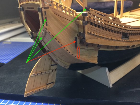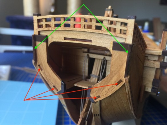 Green arrows show reproduced parts from the kit. The plates at the stern seem too big, but they cover interlocking tabs in the wooden parts. Red arrows show new vinyl copper plates.