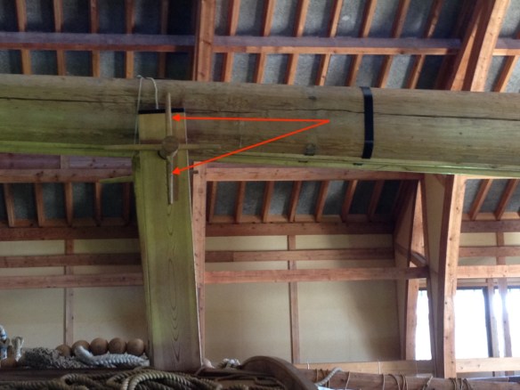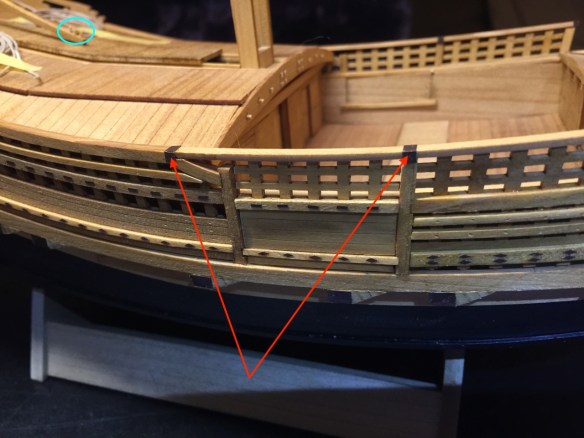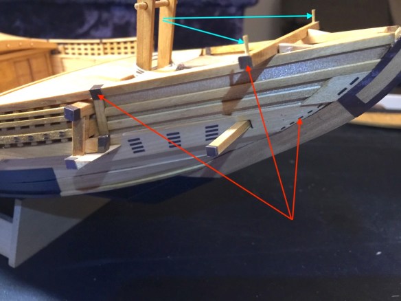 I also added similar posts near the end of the large tiller. I don’t know what purpose these serve, perhaps as handgrips or tie points for ropes. But, I see these in a lot of the bezaisen drawings, paintings, and model photos.
