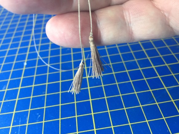 I used a fairly thin polyester thread for these. This was actually my second try. For the first ones, I used thread that was too thick and they just didn’t look right. I think the thread in these final tassels are a bit on the thick side too, but at this scale, they were abouit as good as I was going to get.