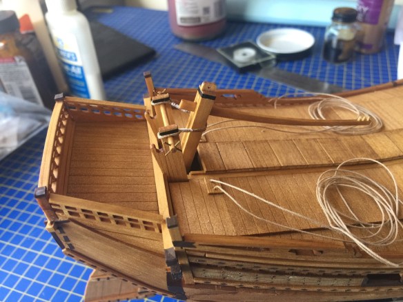 Another detail I finished was part of the kit, and it’s the restraining rope that goes around the rudder post, just below the tiller. My rudder hangs in place, but the lines attached to it want to pull it upwards and push the tiller downwards. I made sure this rope is tight enough to prevent this from happening.