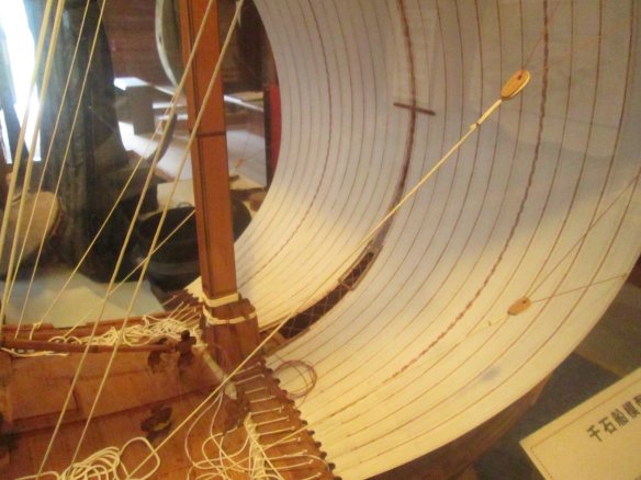 I don’t think I’m going to be able to really simulate the sails at this scale the way I’d like to. I may just end up stitching all the seams. Even at a big scale, like the model I photographed at the Sea Folk Museum in Toba, Japan, you mostly get a sense that the sails are different from western sails.