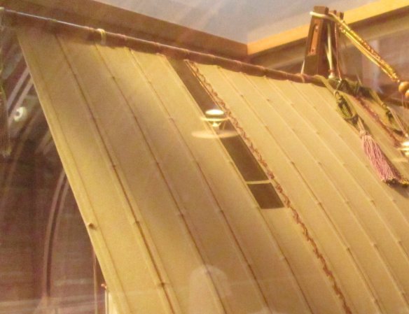 The big issue is that I’d love to be able to detail the Japanese-style sails, which are made of separate panels that are laced together. The design is such that the sails are effectively self-reefing, so that they spill the wind when it gusts. This design is more apparent on sails of smaller vessels, and I don’t know if the lacing between all of the panels are that way, or just between the four large groups of panels. But, you can see the idea in a pair of photos from ModelShipWorld member marcjp, who lives in Osaka, Japan, and took these photos of the museum ship Naniwa Maru.