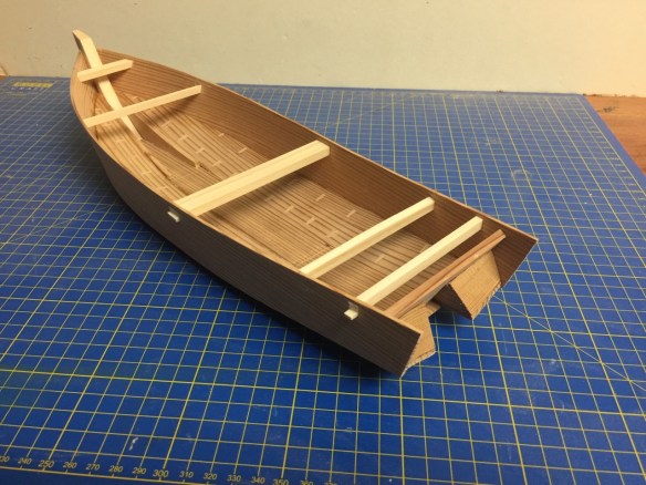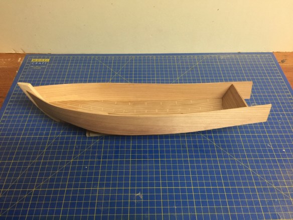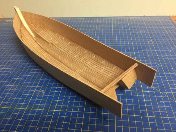 During the hull plank bending process, I had actually made the small wedge-shaped box structures that fit behind the todate. I don’t know the term for these – looking into that now. I wanted to add these as soon as possible, as they help support the todate, the transom, which previously was supported only by the glue joints with the hull bottom.