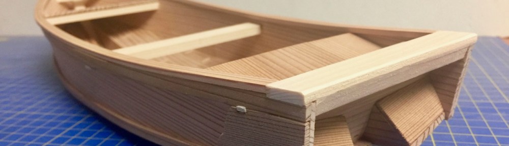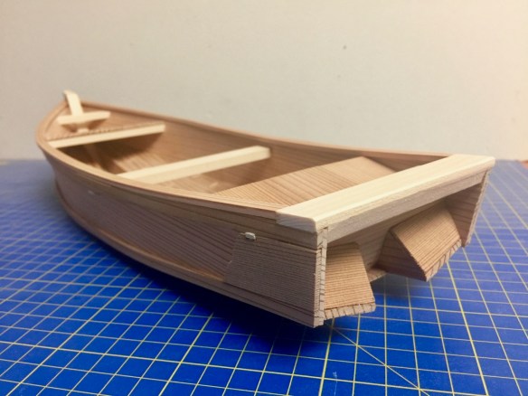 You’ll note that I’ve also instealled the toko, or the heavy beam at the stern, which serves as a mount for the sculling oar. The toko on the boat depicted in the museum drawings had a more complicated shape, and I was a bit confused about the details I was looking at. Fortunately, the boat built by Brooks and Co. has a much plainer toko that was easy to replicated from photos.