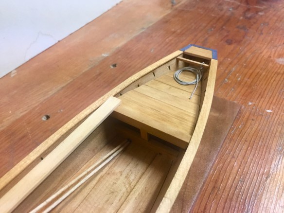 I don’t know if the boards that make up these decks were removable. Underneath, I left the ends open, so things could be tucked in there for storage, but only for smaller things, as the support posts of the beams cut the openings in half. If the deck beams were removable, there should be finger holes in at least some of the deck boards, so they could be easily lifted up. Sometimes, there was also a V-shaped pattern inscribed across the boards to make it easier to identify which boards go where. This is less important at the bow, where the boards lengths vary greatly, making them more easily identifiable as to which one goes where.