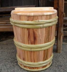 Miso barrels seem simpler, though I haven’t been able to get decent dimensions on them. For those who don’t know, miso is a paste made from fermented soy beans. It is used as a flavoring and is probably most commonly known as a soup base. As for the barrels, I have a feeling they weren’t as standard as sake barrels, so I haven’t been able to find common dimensions. They have a simpler, bucket shape, but I haven’t figured out yet a good way to simulate the wooden bindings on them without getting into weaving thin strips of rattan. Sake barrels actually have the same bindings, but their straw mat coverings hide that detail.