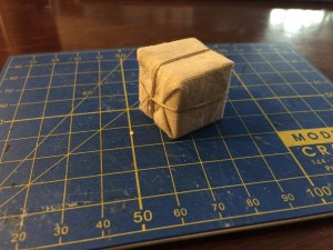 I then used some heavy thread to represent twine used to tie it all together. Note that all the wrapping is glued up first. The final package is shown below.