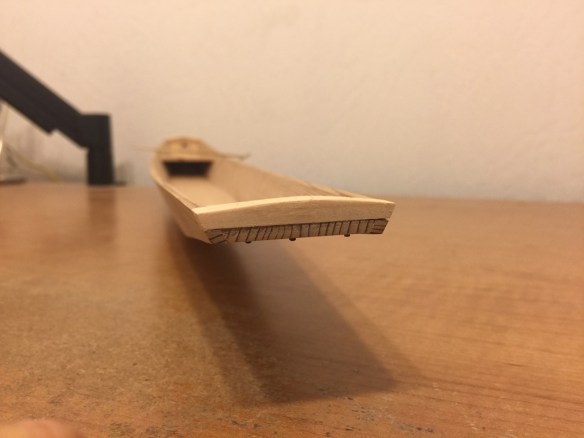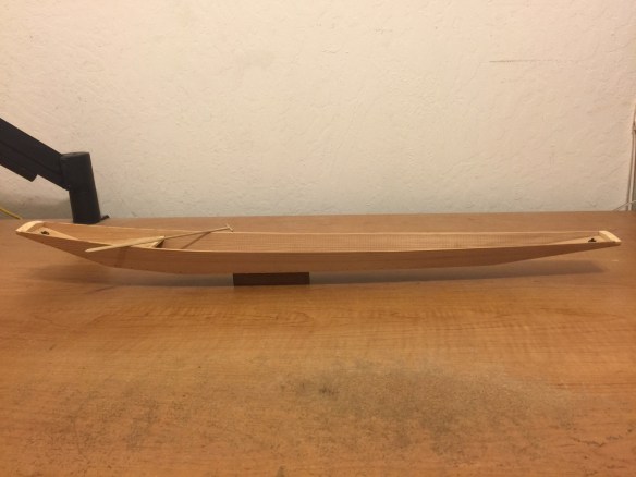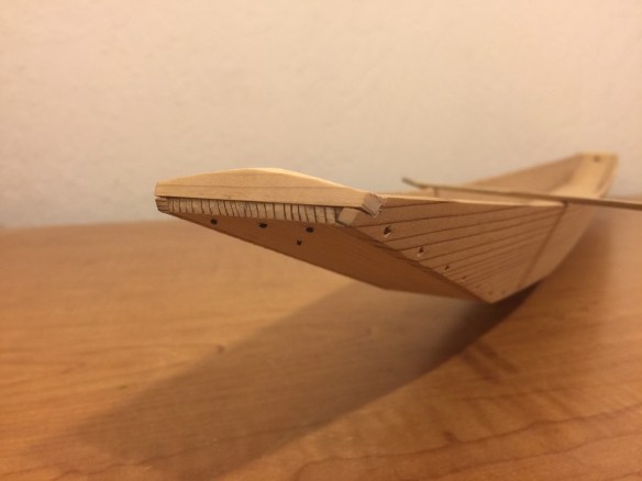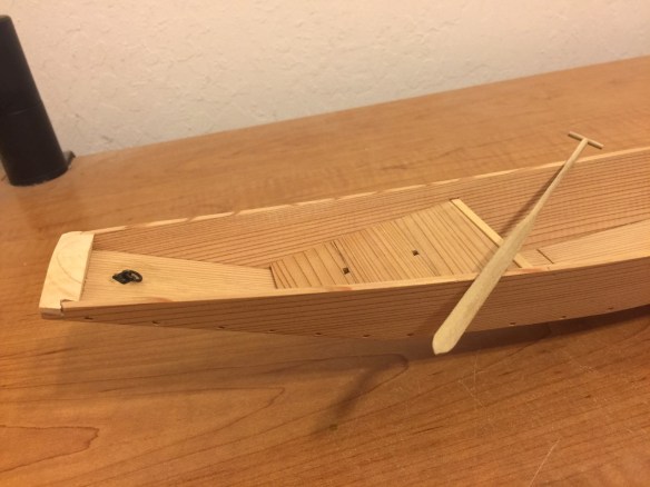 What you may notice on the actual Honryou, is that there are a couple ringbolts, one at each end of the boat. Plus, if you look closely, you’ll notice there are mortises in those blocks at the ends, and bolts that are visible under the bow and transom. I decided to add that detail. In addition, I needed to make a new kai, or paddle for it.